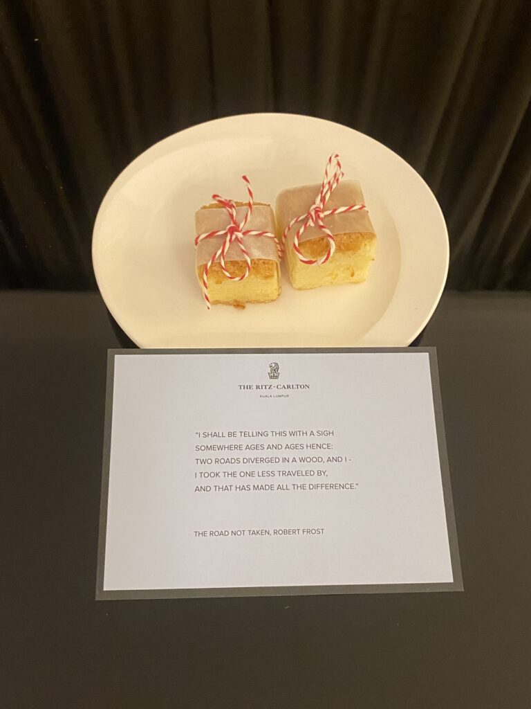部屋に戻ると甘いケーキとメッセージカードが置いてあった。リッツカールトンのウェルカムギフトみたい!🎁